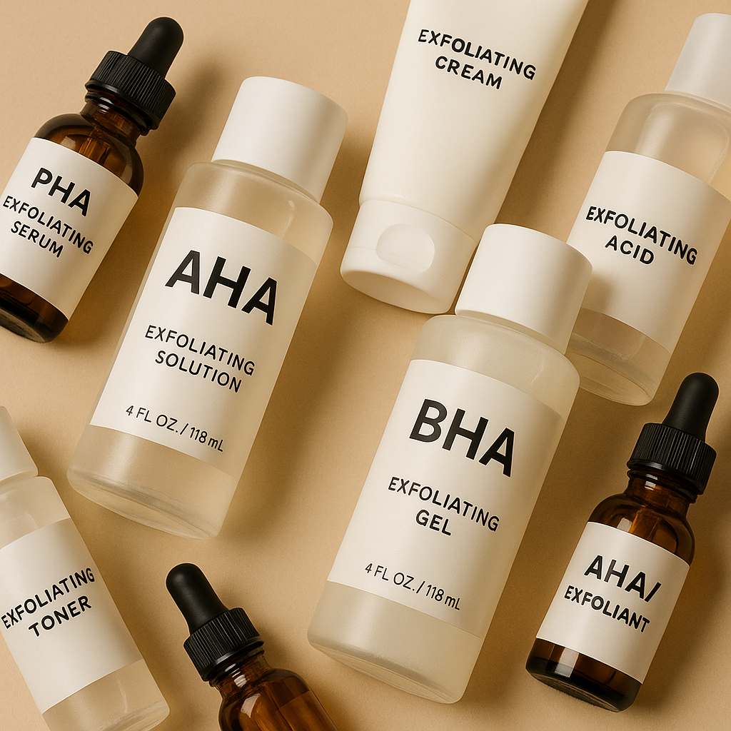 Suggested Image 1: Bottles of AHA and BHA serums. Alt: ‘AHA BHA exfoliating acids skincare products lineup’.